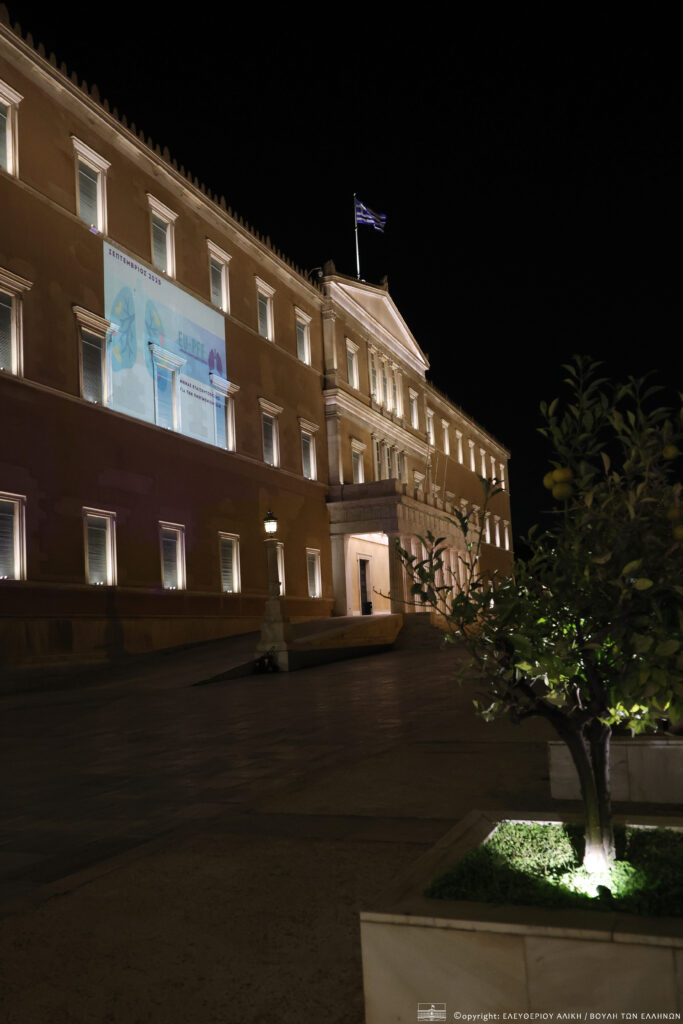 • Η Βουλή των Ελλήνων, με την ανάρτηση αφίσας στην πρόσοψή της, έργο της Ουρανίας Καλαϊτζάκη.